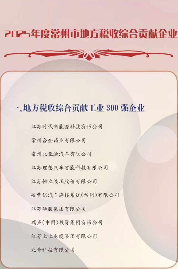 2026/02/18 祝贺曼淇威公司荣登“2025年度常州市地方税收综合贡献工业300强企业”。